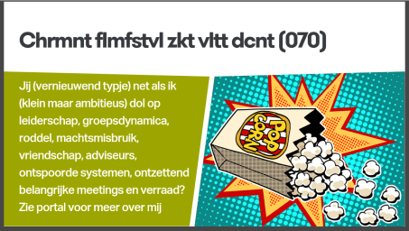 Maar Corporate Bodies maken we samen. Misschien heb je een suggestie voor een film die je met jouw studenten zou willen bekijken. Kan. Misschien heb je zelf al de nodige ervaring met film in het klaslokaal en wil je die ervaringen delen met collega’s. Kan ook. Misschien zie je andere mogelijkheden om ‘iets’ te doen rond het thema film en organisatie. Kom maar op. Misschien heb je nog geen idee hoe en wat maar ben je wel geïntrigeerd. Voldoende aanleiding om eens een kop koffie te gaan drinken.