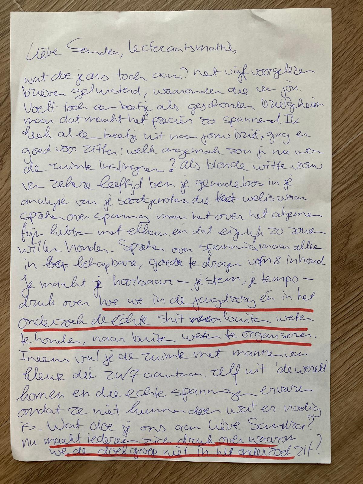 Ik denk aan straatarts Michelle van Tongerloo, die zoveel last heeft van systeemdruk dat ze besloten heeft eigen oplossingen te creëren: van hotelkamers regelen voor dakloze patiënten tot zelf opnameplekken organiseren. Altijd met het belang van de doelgroep voorop. Zulke voorbeelden mis ik tot nu toe in dit onderzoek. Ik ben benieuwd of er in de jeugdzorg ook zulke mensen of initiatieven bestaan.