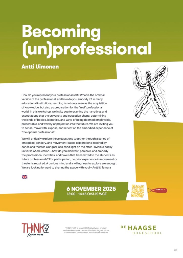 How do you represent your professional self? What is the optimal version of the professional, and how do you embody it? In many educational institutions, learning is not only seen as the acquisition of knowledge, but also as preparation for the “real” professional world. In this workshop, we invite you to examine the narratives and expectations that the university and education shape, determining the kinds of bodies, identities, and ways of being deemed employable, presentable, and worthy of projection into the future. We are inviting you to sense, move with, expose, and reflect on the embodied experience of “the optimal professional”.